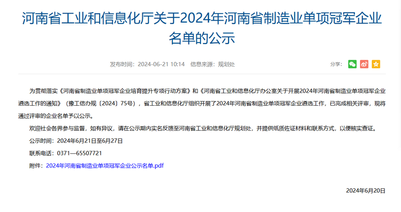6月21日,河南省工业和信息化厅发布了《关于2024年河南省制造业单项冠军企业名单的公示》,太阳成集团tyc荣登榜单。
