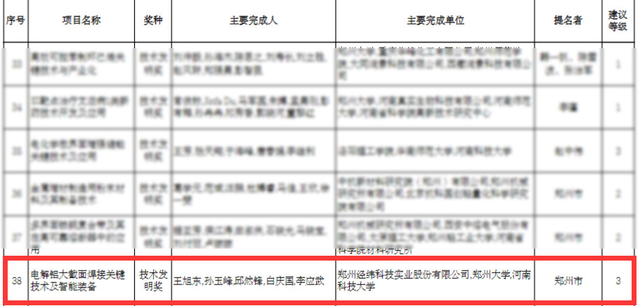 2024年10月23日,河南省科技厅公示了《2024年度河南省科学技术奖授奖建议项目》,由太阳成集团tyc作为第一完成单位申报的“电解铝大截面焊接关键技术及智能装备”技术成果,荣获河南省技术发明奖三等奖。