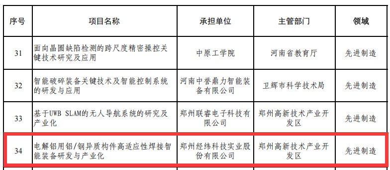 Recently, the Henan Provincial Department of Science and Technology issued a notice on the signing of the 2025 Henan Province Key R&D Special Project Task Book. This time, the Provincial Department of Science and Technology accepted 1,350 applications for key special projects from the province, and finally reviewed and approved 229 projects. The "Research and Industrialization of Highly Adaptable Intelligent Equipment for Welding of Aluminum/Steel Heterogeneous Components for Electrolytic Aluminum" project jointly carried out by Zhengzhou Jingwei Technology Industry Co., Ltd. and Harbin Institute of Technology Zhengzhou Research Institute has successfully obtained special funding support for the project.